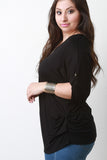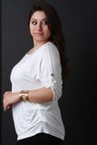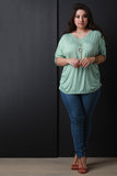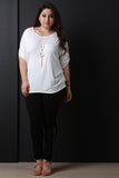 This plus size top features a round neckline, pull tab sleeves with button accent, rounded hem, and gathered accents at the sides. Includes a long necklace with acrylic shape pendants. Other accessories sold separately. Made in U.S.A. 95% Rayon, 5% Spandex.