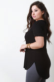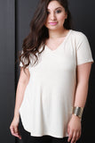 This plus size top features a ribbed knit fabrication, v-neckline, short sleeves construction, and high-low curved hemline. Accessories sold separately. Made in U.S.A. 97% Rayon, 3% Spandex.