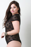 This bodysuit features a grid pattern lace throughout, round neckline, and cap sleeve construction. Finished with a double snap button at crotch for easy on/off. Accessories sold separately. Made in U.S.A. 94% Polyester, 6% Spandex.
