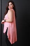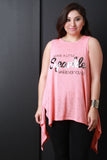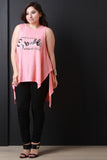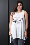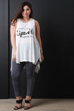This top features a round neckline, "LEAVE A LITTLE SPARKLE WHEREVER YOU GO" graphic print at front, sleeveless construction, and high low hemline. Accessories sold separately. Made in U.S.A. 62% Rayon 38% Polyester.