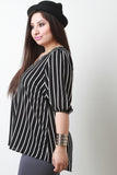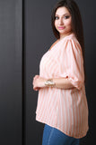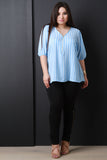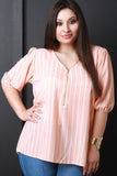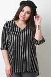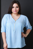 This plus size blouse features a zipper v-neckline, quarter-length balloon sleeves with elasticized hem, vertical stripes on texture fabrication. Accessories sold separately. Made in U.S.A. 100% Polyester.