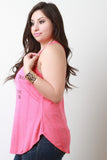 This plus size top features a " Everything Will Be Okay In The End. If It's Not Okay, It's Not The End." graphic print, racer back tank top design, scoop neckline and a flare rounded hem line. Accessories sold separately. 97% Rayon 3% Spandex.