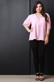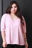 This plus size top features an adjustable zippered v neckline, gathered details on the sleeve, elastic hem sleeve, with a flare hemline and a lightweight woven fabrication. Accessories sold separately. 100% Polyester