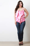 This plus size top features a tie dye jersey knit fabrication, spaghetti shoulder straps, scoop neckline and back, tiered ruffles at front, and asymmetrical hemline. Accessories sold separately. Made in U.S.A. 95% Rayon, 5% Spandex.