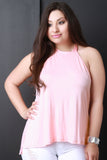 This plus size top features a soft knit fabrication, sleeveless construction, and keyhole opening design at back, tie closure, loose fit, with a high low hem line. Accessories sold separately. Made in U.S.A. 95% Rayon 5% Spandex.