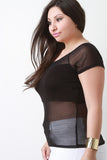 This plus size top features a mesh panel construction, jersey knit bustier cover, short sleeves, and finished with a boat neckline. Accessories sold separately. Made in U.S.A. Self: 90% Nylon, 10% Spandex. Contrast: 97% Rayon, 3% Spandex.