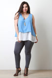 This plus size top features a sleeveless design, contrast hem, double layer, embroidered dot trim, self lined, wide flowy hemline. Accessories sold separately. 100% Polyester