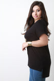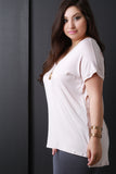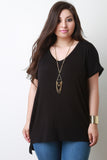 This oversized plus size tee features a v-neckline, short cuffed sleeves, side slits, and high-low hem. Accessories sold separately. Made in U.S.A. 95% Rayon, 5% Spandex.
