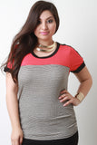 This plus size top features color block yoke, horizontal striped main, round neckline, short sleeves with gold-tone button accents, and ruched sides. Accessories sold separately. 97% Rayon, 3% Spandex.