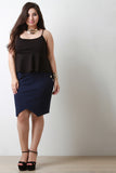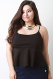 This top features a textured knit fabrication, boat neckline, spaghetti straps, peplum design, and lace-up strap open back. Finished with a cropped hemline. Accessories sold separately. Made in U.S.A. 96% Polyester, 4% Spandex.