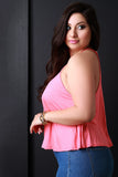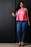 This top features a jersey knit fabrication, sleeveless construction, racerback, and halter neckline. Finished with a cropped hemline. Accessories sold separately. Made in U.S.A. 95% Rayon, 5% Spandex.