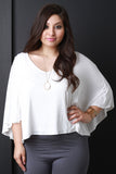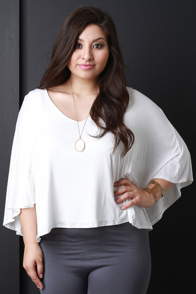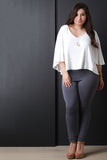 This plus size top features a v-neckline with plunging back design, three-quarter dolman sleeve construction, and high-low hemline. Accessories sold separately. Made in U.S.A. 95% Rayon, 5% Spandex.