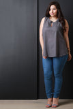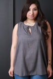 This plus size top features a round neckline with grommets embellishment, keyhole cutout design, sleeveless construction, and flowy curved hemline. Accessories sold separately. Made in U.S.A. 100% Cotton.