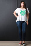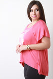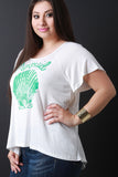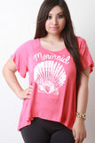 This plus size top features a "mermaid" and clam shell graphic print on jersey knit fabrication, scoop neckline, and short sleeves construction. Finished with a high low hemline. Accessories sold separately. Made in U.S.A. 95% Rayon, 5% Spandex.