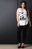 This plus size top features a jersey knit fabrication with a panda and "Oh no it's Monday again" graphic print in front, sleeveless fit, and scoop neckline. Finished with a rounded high low hemline. Accessories sold separately. Made in U.S.A. 97% Rayon, 3% Spandex.