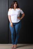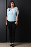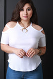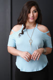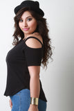 This top features a ribbed knit fabrication, high round neckline, cold should design, and short sleeves fit. Finished with a high low rounded hemline. Accessories sold separately. Made in U.S.A. 48% Polyester, 48% Cotton, 4% Spandex.
