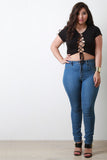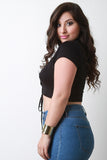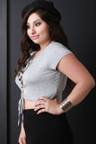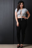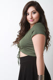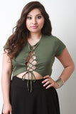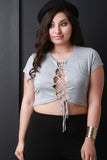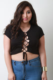 This top features soft jersey knit, round neckline, lace-up front, and short sleeves. Accessories sold separately. Made in U.S.A. 95% Rayon, 5% Spandex.