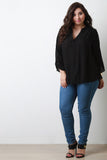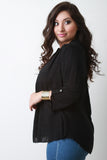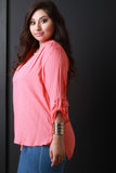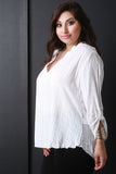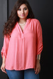 This plus size top features a woven knit fabrication, half placket neckline, long sleeves with button tab, and flat collar. Finished with a slight high low hemline. Accessories sold separately. Made in U.S.A. 100% Rayon