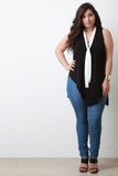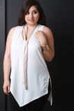This plus size top features a v-neck with a contrasting neck tie, sleeveless design, side slits, and angled hem. Accessories sold separately. Made in U.S.A. 96% Polyester, 5% Spandex.