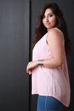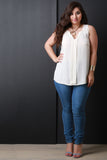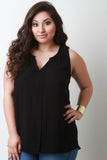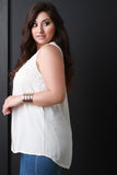 This plus size top is sleeveless design with a v-neck; featuring a pleated detail along the front. Unlined. High-low hemline. Accessories sold separately. 100% Rayon.