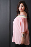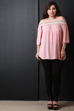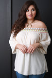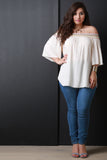 This plus size top features an off the shoulder neckline, embroidered elastic, short bell sleeves, and a loose flare cut. Accessories sold separately. 100% Rayon.