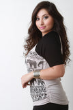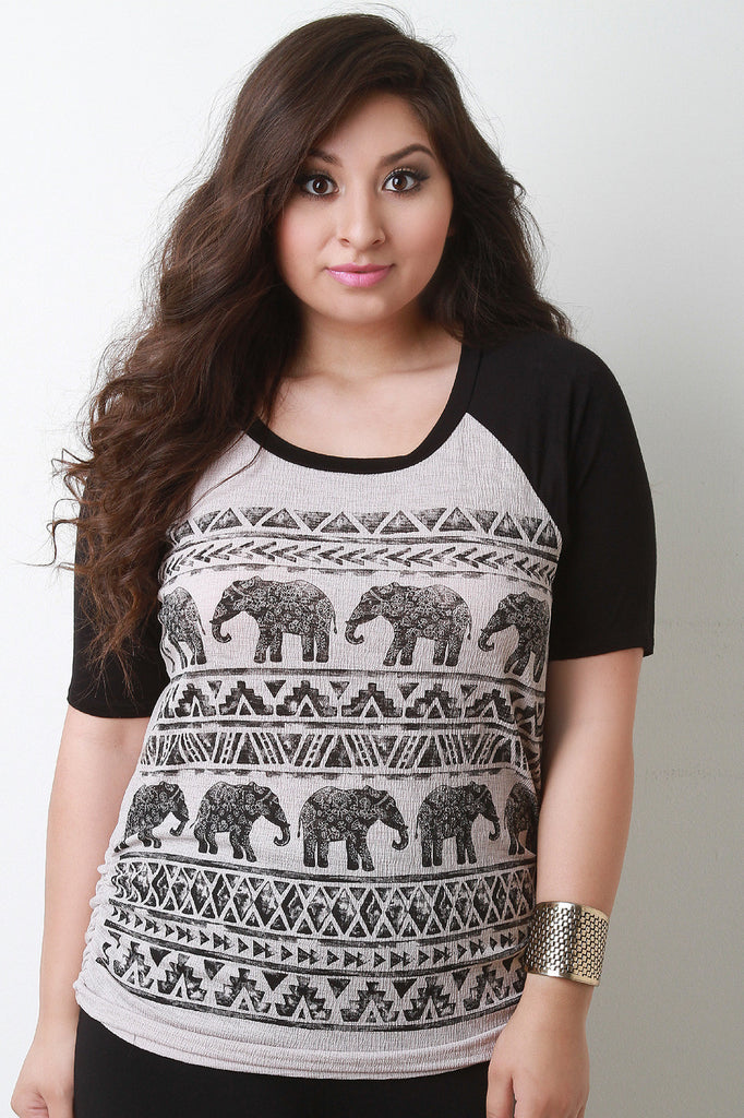 This plus size top is baseball tee silhouette; featuring, quarter long sleeves, scooped neckline, and ruched sides. Designed with an elephant graphic print on unlined chiffon like material. Accessories sold separately. 97% Rayon. 3% Spandex. Con: 96% Polyester 4% Spandex.