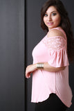 This plus size top features a cold shoulder cut out, scoop neckline, floral lace yoke, gathering details, half bell sleeves, loose billowy fit, with a soft knit fabrication. Accessories sold separately. 97% Rayon, 3% Spandex. Contrast: 92% Nylon, 8% Sppandex.