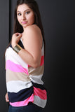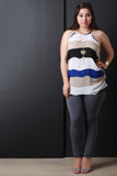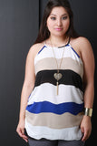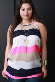 This plus size top features flowy stiped chiffon fabrication, halter neckline, sleeveless fit, and cinched sides detail. Includes a heart pendant necklace. Other accessories sold separately. Made in U.S.A. 100% Polyester.