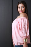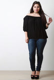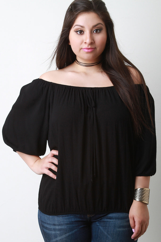 This plus size top is peasant top silhouette, featuring an elasticized off the shoulder design. The arms and hem are also elasticized. Finished with a decor bow tie. Accessories sold separately. 100% Rayon.