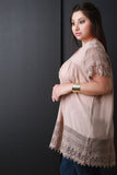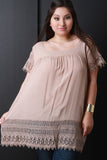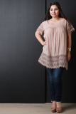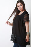 This top features a woven knit fabrication with crochet lace trim, square neckline, short sleeves construction, and relaxed fit. Accessories sold separately. 95% Rayon, 5% Cotton.