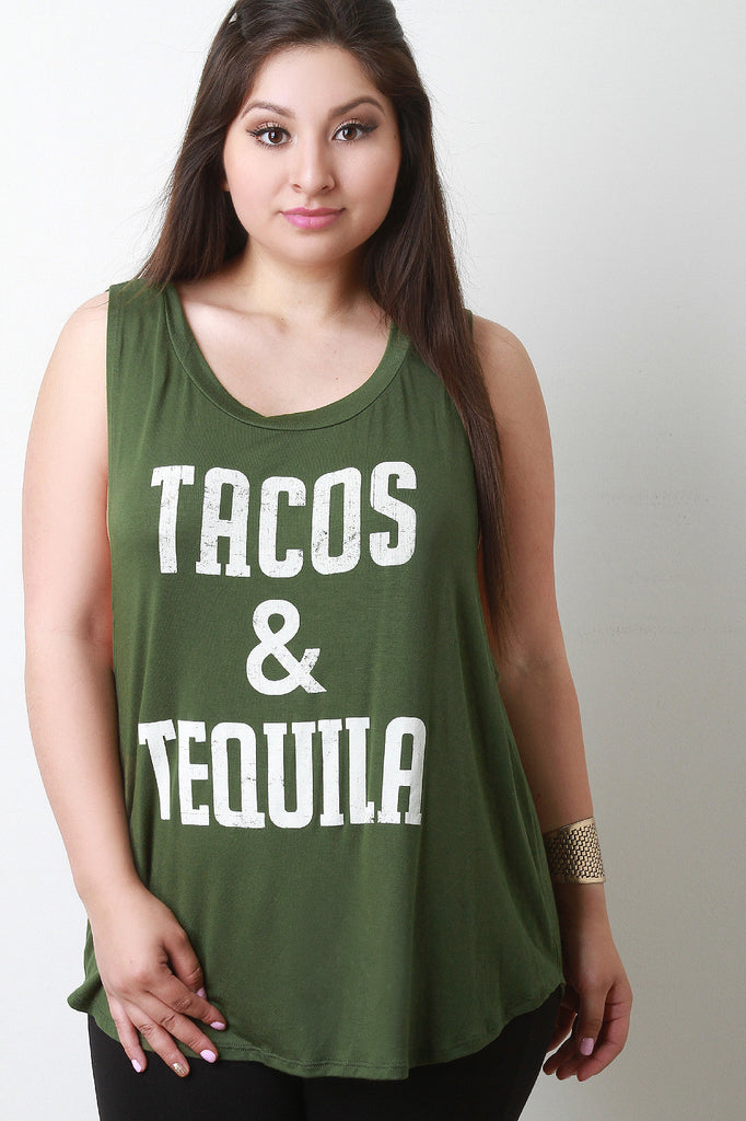 This plus size casual top is sleeveless design with a scooped neckline and dropped armhole. Curved hemline. Finished with print "Tacos & Tequila". Accessories sold separately. 97% Rayon. 3% Spandex.
