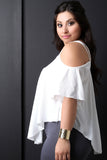 This plus size top features a textured woven knit fabrication, v-neckline, cold shoulder with double straps detail, elbow sleeves, and rounded hemline. Finished with a ruffled trim and design. Accessories sold separately. Made in U.S.A. 98% Polyester, 2% Spandex.