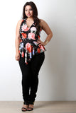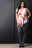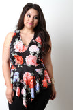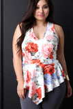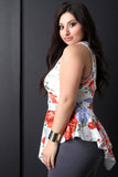 This plus size top features a soft stretchy knit fabrication, floral print, v-neckline, sleeveless fit, and peplum design with asymmetrical hemline. Accessories sold separately. Made in U.S.A. 95% Polyester, 5% Spandex.