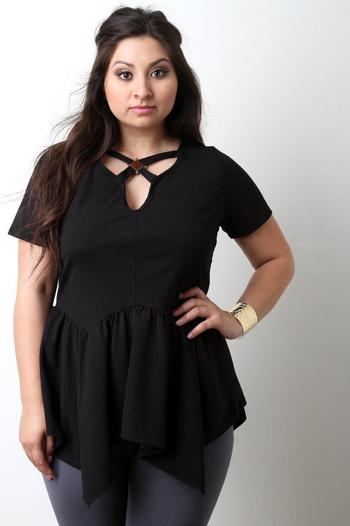 This plus size top features a soft knit fabrication, v-neckline with gold accented crisscrossing strap detail, cap sleeve construction, and ruffled bottom with asymmetrical hemline. Accessories sold separately. Made in U.S.A. 94% Polyester, 6% Spandex.