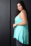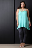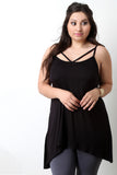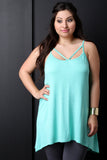 This plus size top features a jersey knit fabrication, scoop neckline with a v-strap design, spaghetti strap, and finished with a high-low hemline. Accessories sold separately. Made in U.S.A. 95% Rayon, 5% Spandex.
