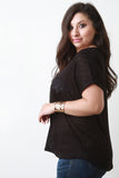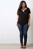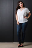 This plus size top features a cross strap key hole neckline, short dolman sleeves, a loose relaxed fit and a thin knit fabrication. Accessories sold separately. Made in U.S.A. 100% Rayon.
