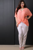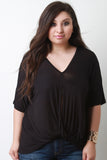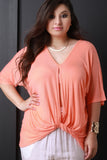 This plus size top features a v neckline, twisted slit front design, deep v back with a strap across, dolman sleeves, and asymmetrical hemline. Accessories sold separately. Made in U.S.A. 87% Polyester, 10% Rayon, 3% Spandex.
