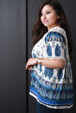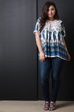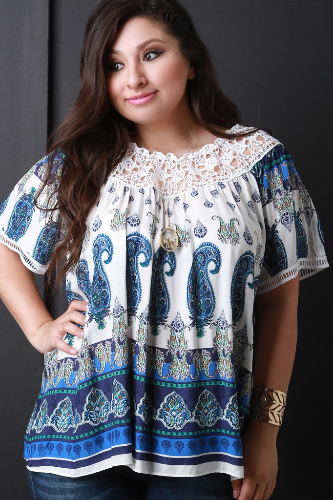 This plus size top features a paisley print fabrication with contrasting crochet panels, round neckline, short sleeve design, and relaxed fit. Accessories sold separately. 100% Rayon.
