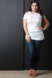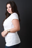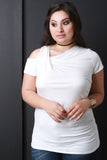 This plus size top features a soft knit fabrication, asymmetrical design with one cold shoulder, one gathered side seam. and an asymmetrical v neckline. Accessories sold separately. Made in U.S.A. 95% Rayon, 5% Spandex.