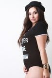 This plus size bodysuit features a "I Will Make Better Mistake Tomorrow" graphic print at front, jersey knit with contrast trims, short sleeve, and finished with double snap button closure at crotch for easy on/off. Accessories sold separately. Made in U.S.A. 95% Cotton, 5% Spandex.