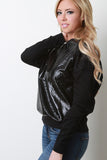 This pullover long sleeve top features embossed vegan leather and knit, round neckline, long raglan sleeves. Accessories sold separately. Shell1: 80% Cotton, 20% Polyester. Shell2: 100% PU.
