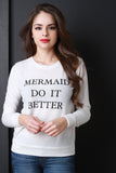 A fleece-like brushed hacci long cuffed sleeves , and a print that reads, "Mermaid Do It Better." Accessories sold separately. Made in U.S.A. 68% Polyester, 4% Spandex, 28% Rayon.