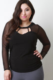 A plus size mesh yoke top featuring a strappy cutout front design, solid main, and long sleeves. Finished with ruched sides and built-in bra. Accessories sold separately. Made in USA. Self: 97% Viscose, 3% Spandex. Contrast: 90% Nylon, 10% Spandex.