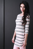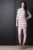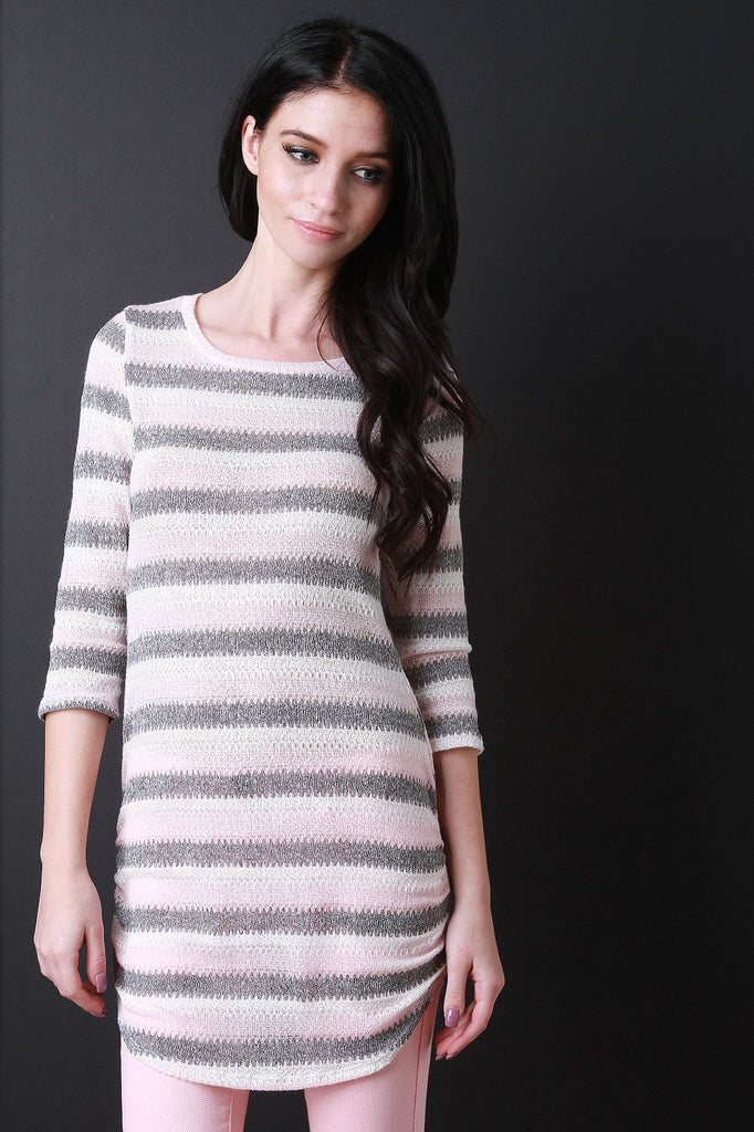 This casual top features a striped, multi colored knit fabrication, three quarter sleeves, a round neckline and gathered material on the sides. Accessories sold separately. Made in U.S.A. 95% Polyester, 5% Spandex.