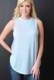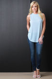 This two tone top features a jersey knit fabrication, mock neckline, sleeveless construction and finished with a high low hemline. Accessories sold separately. Made in U.S.A. Self: 72% Rayon, 24% Polyester, 4% Spandex. Contrast: 65% Rayon, 35% Polyester.