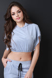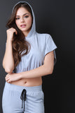 This crop top features a soft vegan suede fabrication, cap sleeves, hooded neckline, and elasticized cropped hemline. Accessories sold separately. Made in U.S.A. 95% Polyester, 5% Spandex.
