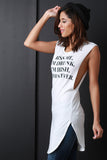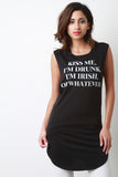 This top features a jersey knit fabrication, round neckline, sleeveless construction with dropped arm holes, and a round hemline. Finished with a print that reads, "KISS ME, I'M DRUNK,I'M IRISH, OR WHATEVER." Accessories sold separately. Made in U.S.A. 96% Polyester, 4% Spandex.