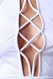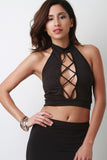 This top features soft stretchy fabrication, mock neckline, crisscross lace up front, and open back halter construction. Finished with double button elasticized hook at nape, and crop hemline. Accessories sold separately. Made in U.S.A. 87% Polyester, 13% Spandex.