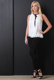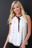 This sleeveless top features a half-placket construction with a contrasting self-tie bow neckline, pinch stitch detailing, diamond lace trimming, and shift cut fit. Accessories sold separately. 100% Rayon. Contrast: 100% Polyester.
