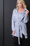 This top features an asymmetrical button-up front, collar neckline, long sleeves, and cinched with D-link belt. Accessories sold separately. 100% Cotton.